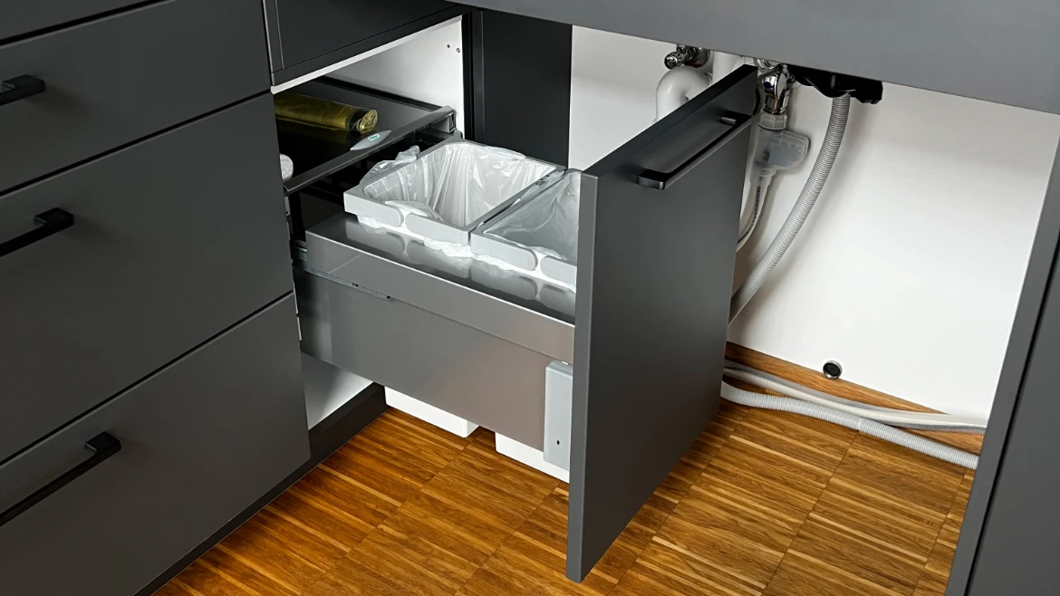 Eine zuvor ungenutzte Ecke verwandelte sich dank eines durchdachten Schienensystems in ein praktisches Mülltrennsystem. Diese kreative Lösung brachte unsere Beraterin Estrid Cordes mit ihrer offenen Herangehensweise ein.