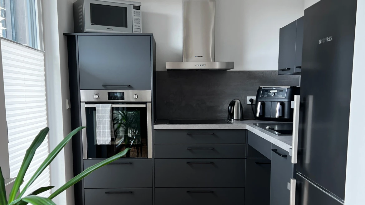 Ein zentrales Element der Planung war die unterfahrbare Spüle – ein echtes Plus für den Alltag. Um dennoch ausreichend Stauraum zu bieten, wurde auf ein unterfahrbares Kochfeld verzichtet – eine clevere Lösung für die begrenzte Fläche. Die Arbeitshöhe bleibt bewusst auf Standardmaß, da die Küche in einer Mietwohnung ist und möglichst dort bleiben und übernommen werden soll. Damit alles leicht erreichbar bleibt, sind die Oberschränke tiefer montiert. Auch die Wahl der Kühl-Gefrierkombination mit einer Höhe von 1,80 m sorgt dafür, dass alle Fächer problemlos zugänglich sind.