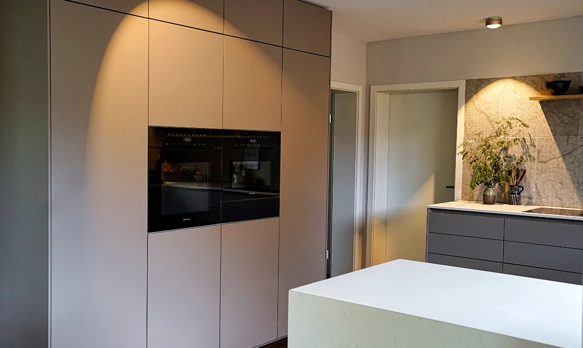 Ein Miele-Backofen in Obsidianschwarz, ein Combi-Dampfgarer und eine Wärmeschublade fügen sich harmonisch ins Höhenraster der Hochschränke ein und unterstreichen die elegante Linienführung.