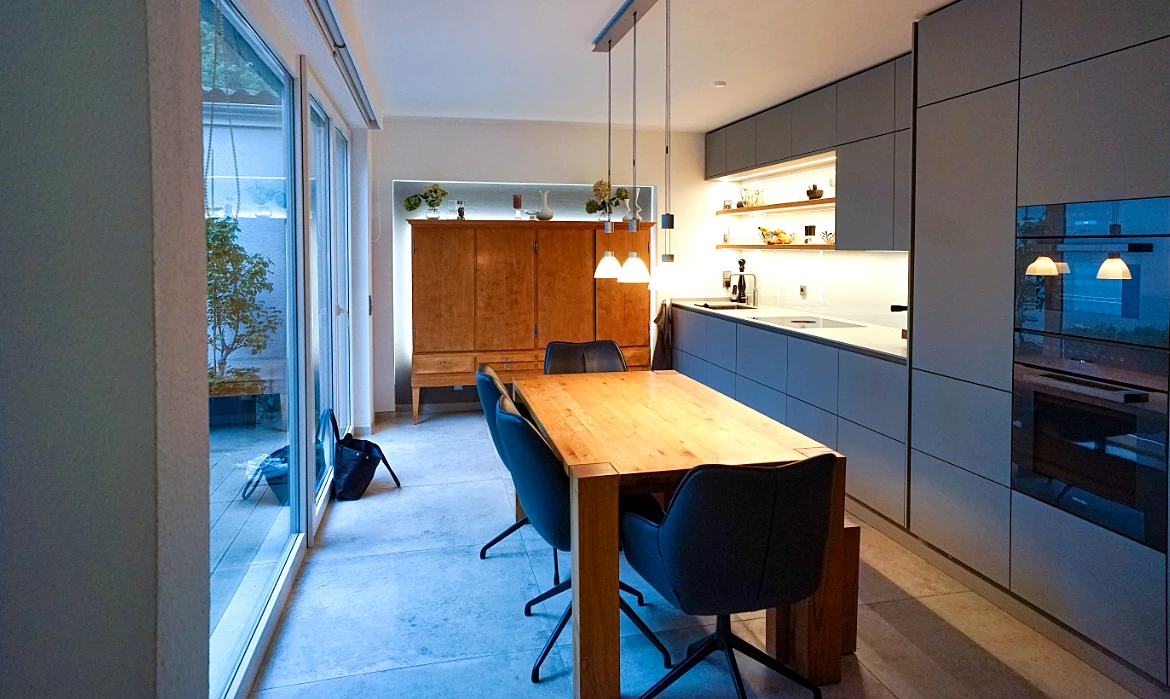Eine kleine Küche wurde zu dieser großzügigen, aufgeräumten Küche mit klaren Linien und abgestimmten Design! Es war kein Problem, auch den alten Geschirrschrank aus den Fünfzigern und unseren Tisch zu integrieren. So war es ab dem ersten Tag unsere Küche! Da in diesem Zuge auch ein Teil des Erdgeschosses umgebaut werden musste, waren wir froh, von Frau Gahr, Frau Stübken und dem Rosenowski-Team so kompetent begleitet worden zu sein.