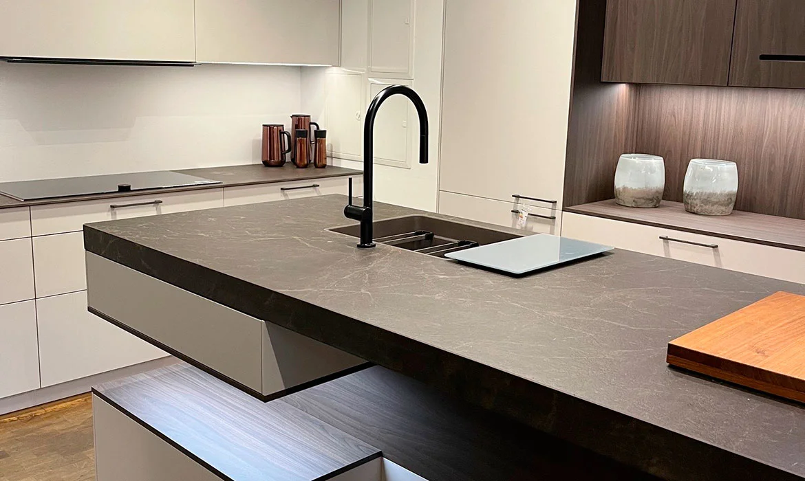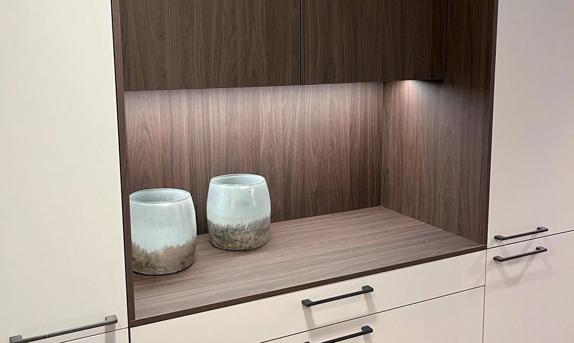 Häcker AV2135/ AV2041, Farbe Satin UV Mattlack/ Walnuss-dunkel, Arbeitsplatte Keramik Emprada satiniert 12mm