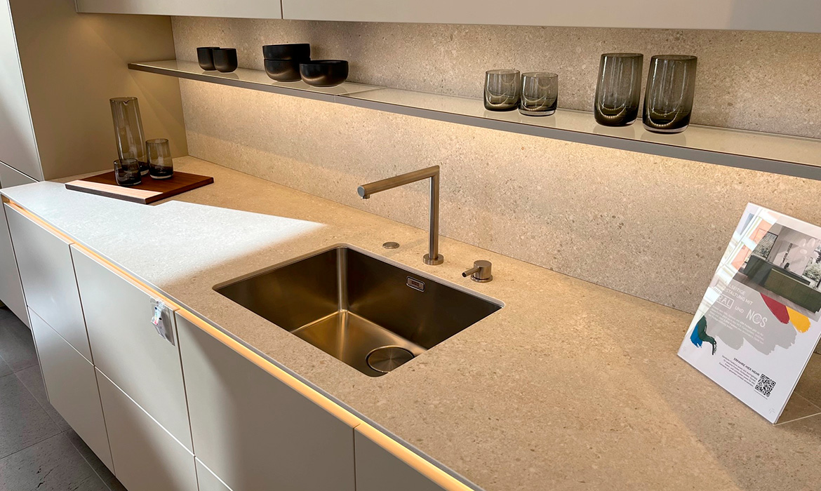 Häcker AV6000GL/ AV6023GL, Farbe NCS Mattlack greige, Nussbaum-elegant, Arbeitsplatte Neolith Shilin Slate 12mm
