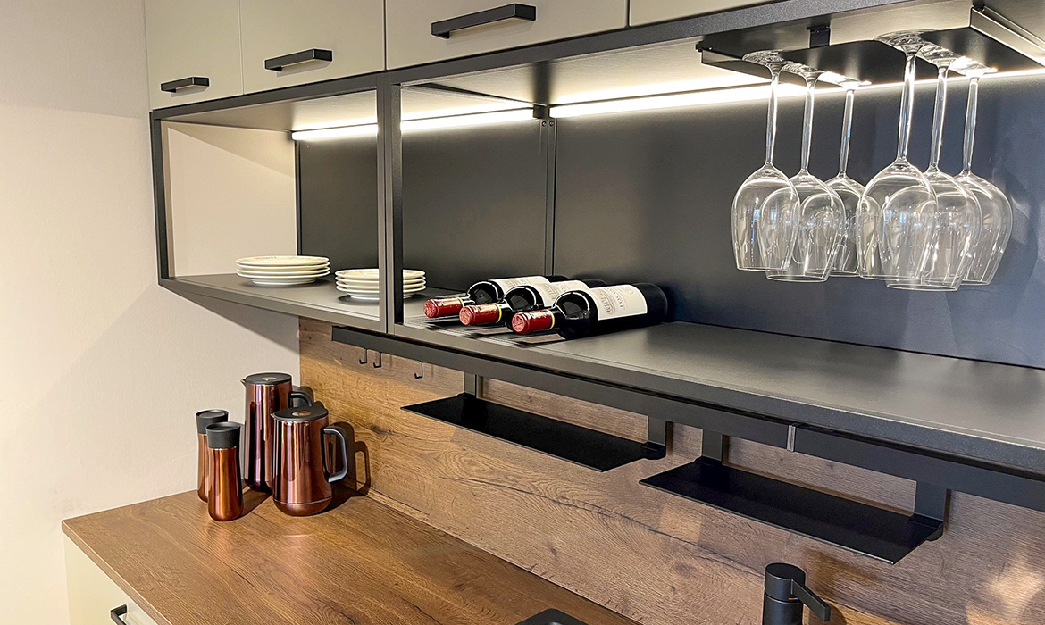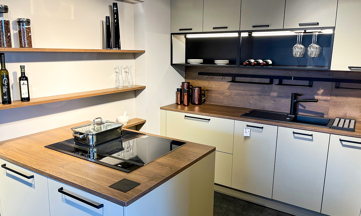 Häcker Porto Selection, Farbe Umbra natur mattlack, Arbeitsplatte Alteiche cognac 25mm