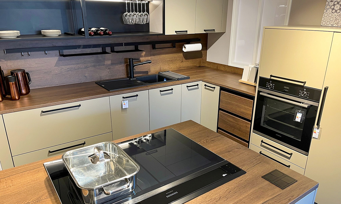 (U-Form Küchenzeile mit Abzugshaube und Nischenverkleidung von Schüller. Die Hochschränke mit Geräten sind nicht im gezeigten Preis enthalten.)